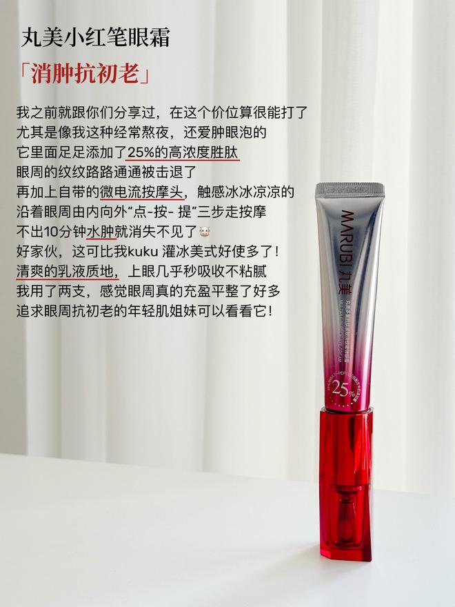 我之前就跟你们分享过,在这个价位算很能打了,尤其是像我这种经常熬夜,还爱肿眼泡的。它里面足足添加了25%的高浓度胜肽,眼周的纹纹路路通通被击退了,再加上自带的微电流按摩头,触感冰冰凉凉的。