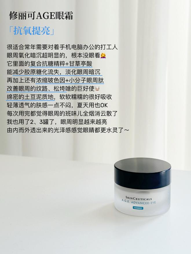 很适合常年需要对着手机电脑办公的打工人,眼周氧化暗沉超明显的,根本没眼看,它里面的复合抗糖精粹+甘草亭酸,能减少胶原糖化流失,淡化眼周暗沉,再加上还有浓缩玻色因+小分子眼周肽,改善眼周的纹路、松垮啥的巨好使。